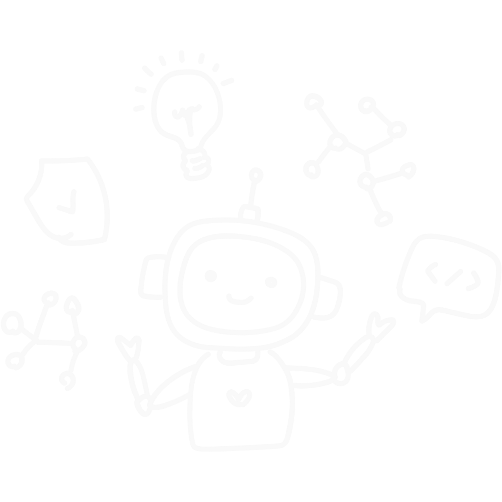 Doodle of a smiling robot with a lightbulb, code symbol, and network diagram on a black background.